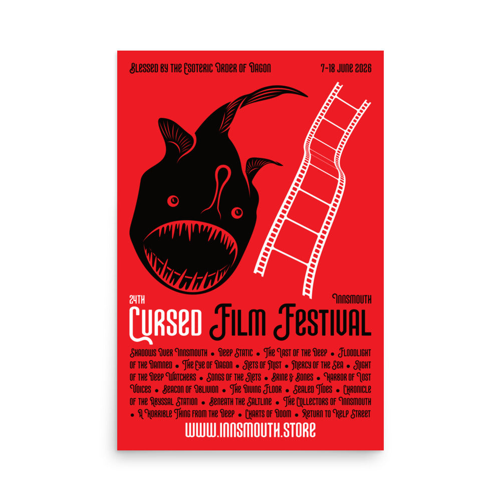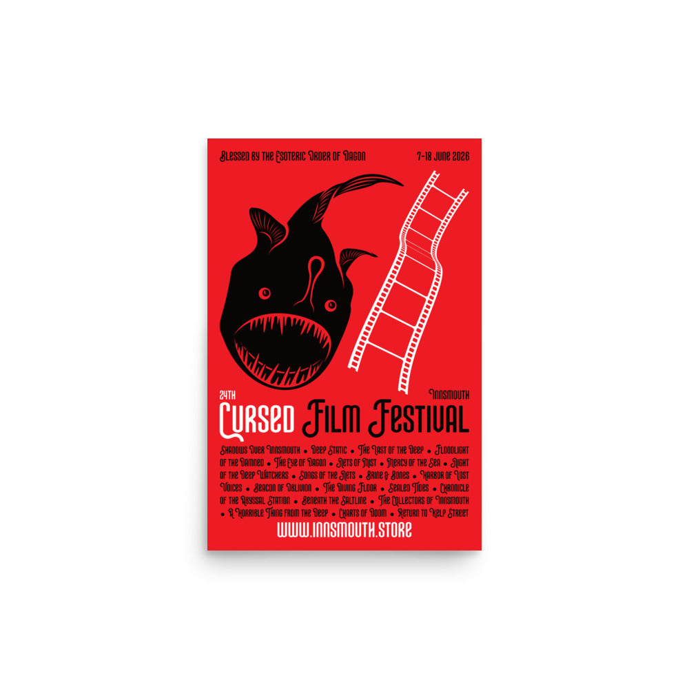 Ein markantes Retro-Poster für das 24. Cursed Film Festival in Innsmouth, das ein alptraumhaftes Tiefseewesen in der Ästhetik eines Vintage-Reiseposters zeigt. Das Design verbindet markante Silhouetten und filmische Filmrollenmotive, um Meeresangst und Pulp-Horror zu wecken. Dunkle, maritime Töne und eine dezente Textur verbinden nostalgischen Charme mit einer bedrohlichen, geheimnisvollen Präsenz.