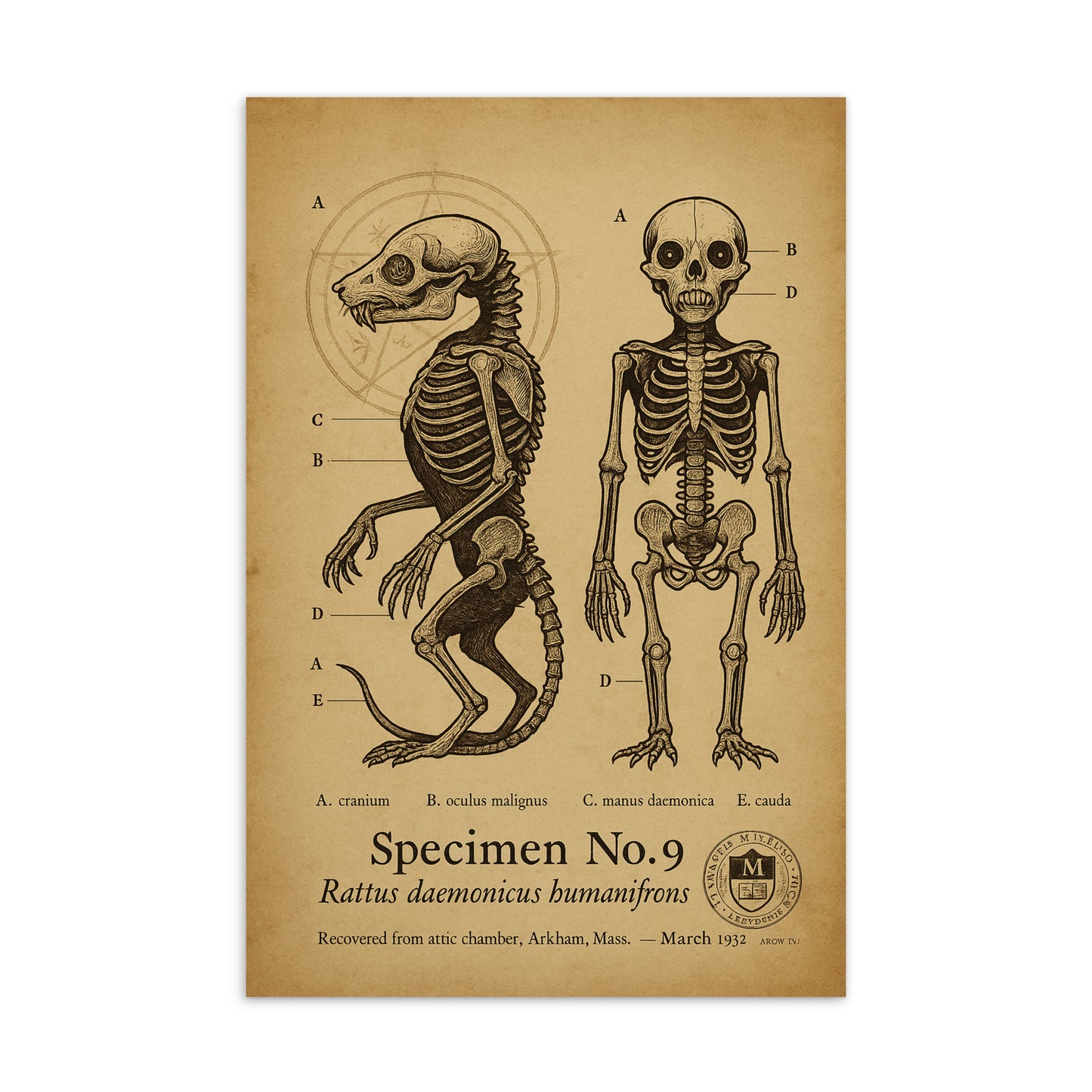 Diese wissenschaftliche Illustration im Vintage-Stil zeigt die angeblichen Skelettreste von Brown Jenkin – entdeckt auf dem Dachboden des Hexenhauses in Arkham. Exemplar Nr. 17, katalogisiert im Okkulten Archiv der Miskatonic University, zeigt die verstörende Mischung aus Nagetier- und Menschenmorphologie. Ein schauriges Relikt arkaner Schrecken und verbotener Rituale.