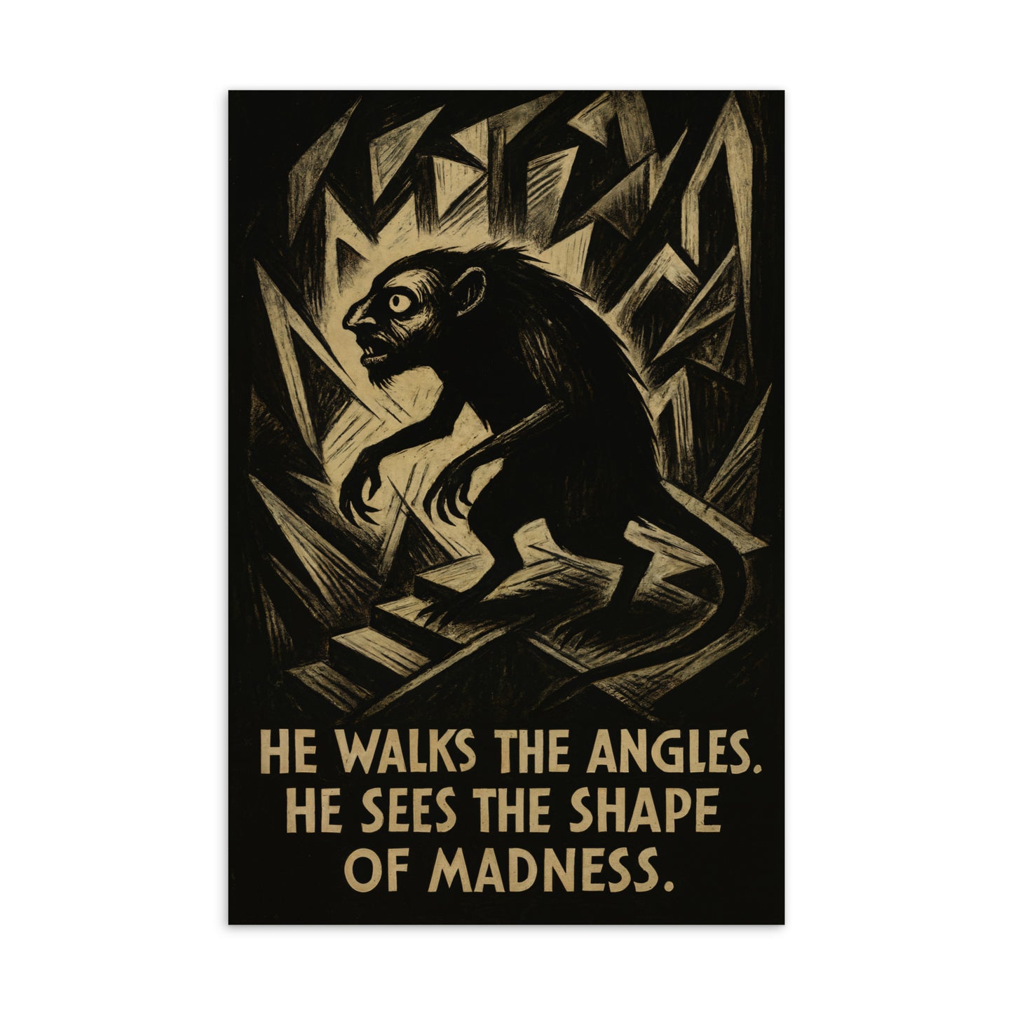 Eine expressionistische Hommage an Lovecrafts Albtraumwesen Brown Jenkin, inspiriert vom filmischen Stil von Das Cabinet des Dr. Caligari. In klarem Schwarzweiß fängt die Illustration die verstörende Geometrie und den Wahnsinn der Traumlande ein. Mit Slogans in zeittypischer Typografie ist dieses Poster eine Hommage an die unsichtbaren Schrecken, die jenseits der Realität lauern.